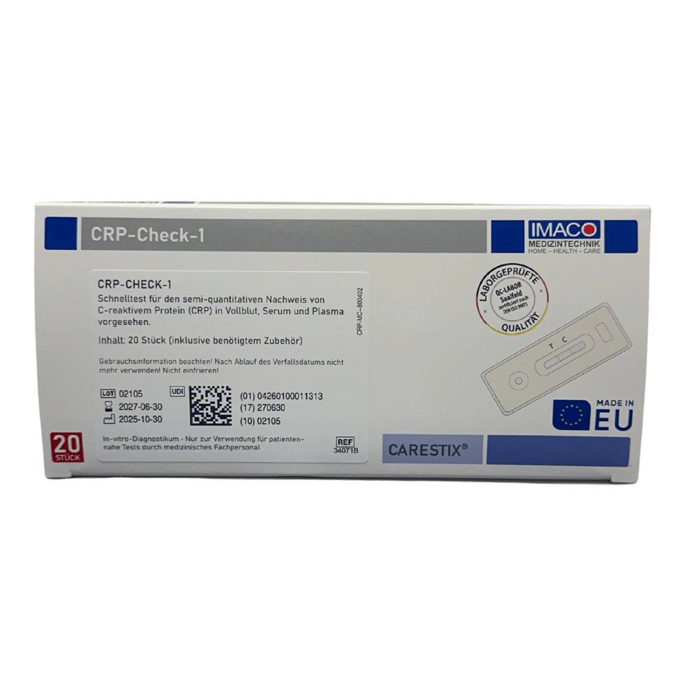 Schnelltest für den semiquantitativen Nachweis von CRP (C-reaktives Protein) in Vollblut, Serum oder Plasma. Auswertung nach 5 Minuten.