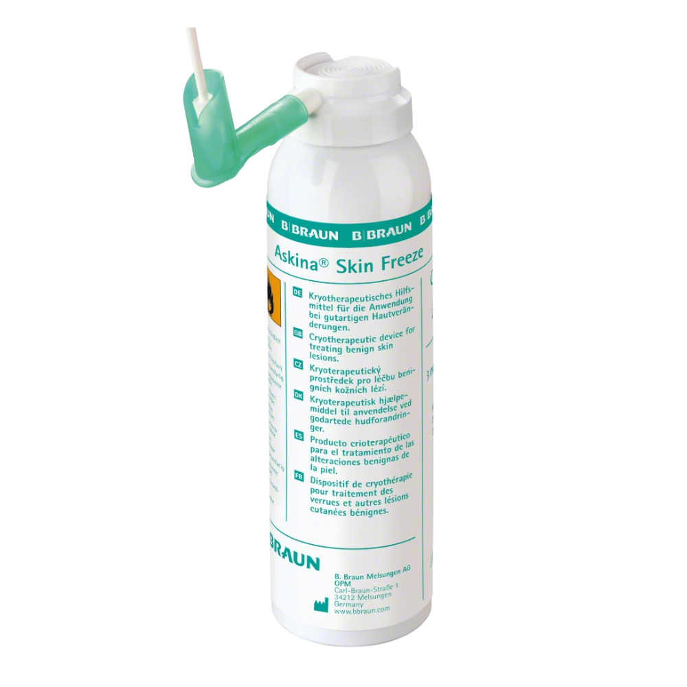 Kryotherapeutisches Mittel bestehend aus Kryospray mit spezieller Applikationstechnik sowie Applikatoren; Mit spezieller vorteilhafter Askina-Technik; Mit dem Stick ruhiges und gezieltes Arbeiten; Kein versehentliches Nachsprühen mit Verätzungsgefahr möglich; Therapieerfolg ohne apparative Investitionen; Hohe Patientenzufriedenheit – unblutig und schmerzarm; Kryotherapie abrechenbar nach EBM, GOÄ oder IGeL